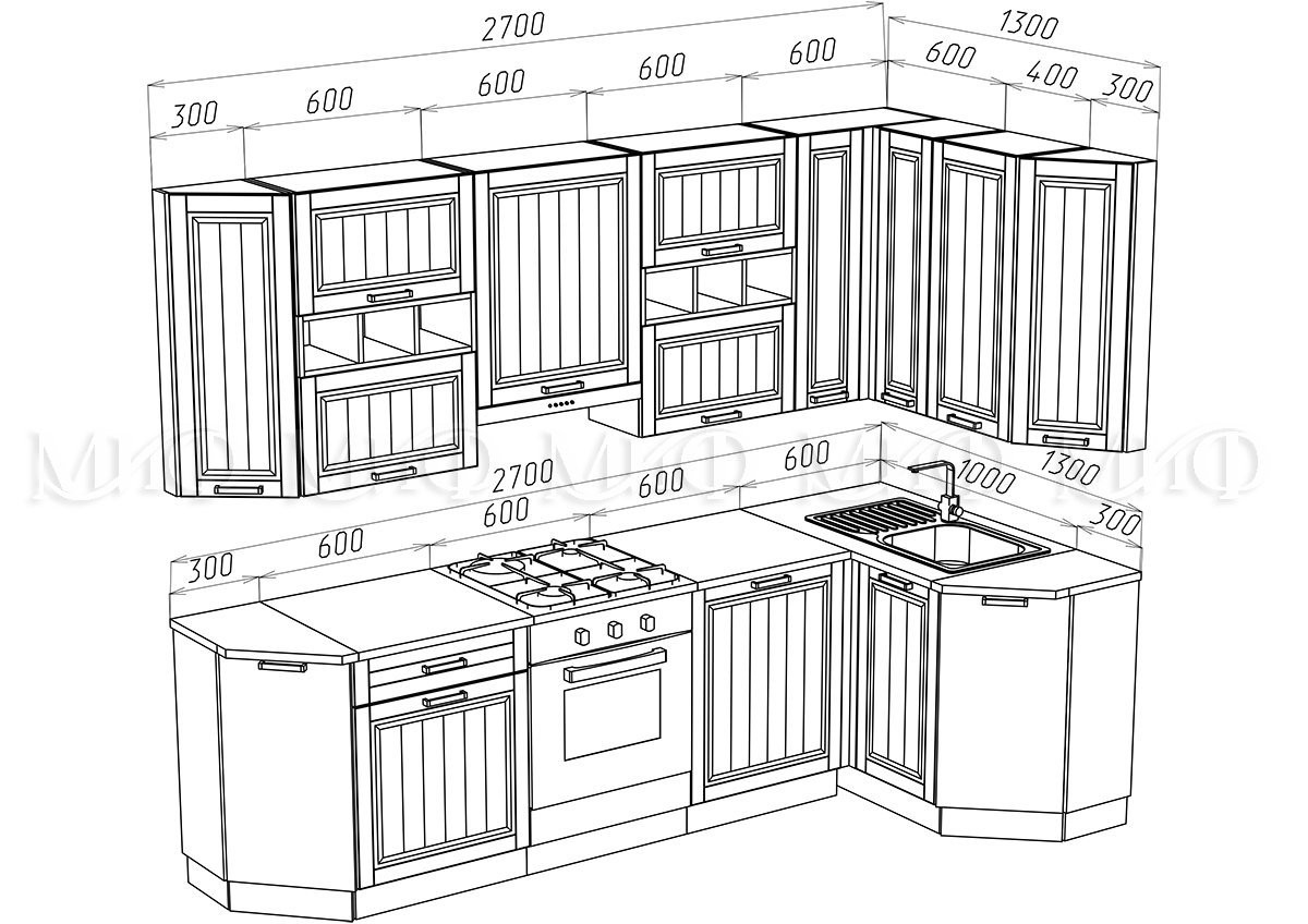 • Глубина шкафов: Верхние 300 мм/Нижние 600 мм/Глубина столешницы 600 мм