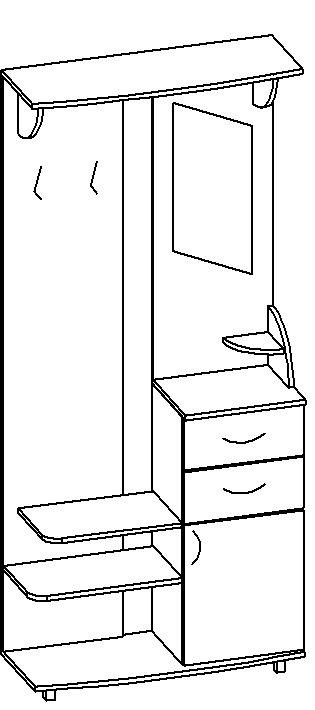 Аккуратная прихожая Юлия представляет собой панель тёмного шоколадного цвета, на которую с одной стороны крепятся три больших трёхрожковых крючка для одежды, а с другой зеркало оригинальной формы. Сверху прихожая Юлия украшена небольшим карнизом, который при желании может служит полочкой для уборов. Под крючками для одежды гарнитура Юлия есть три открытых полки, верхняя из которых может использоваться как сиденье. Справа под зеркалом находиться два выдвижных ящика и тумба для хранения вещей. Фасады выдвижных ящиков и дверка тумбы прихожей Юлия выполнены в контрастном цвете белфорт, за счет чего прихожая смотрится стильно, а не мрачно.